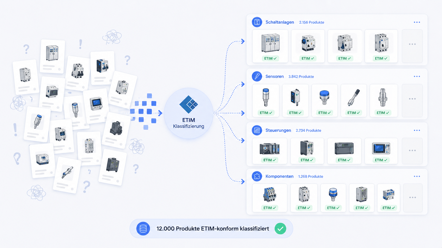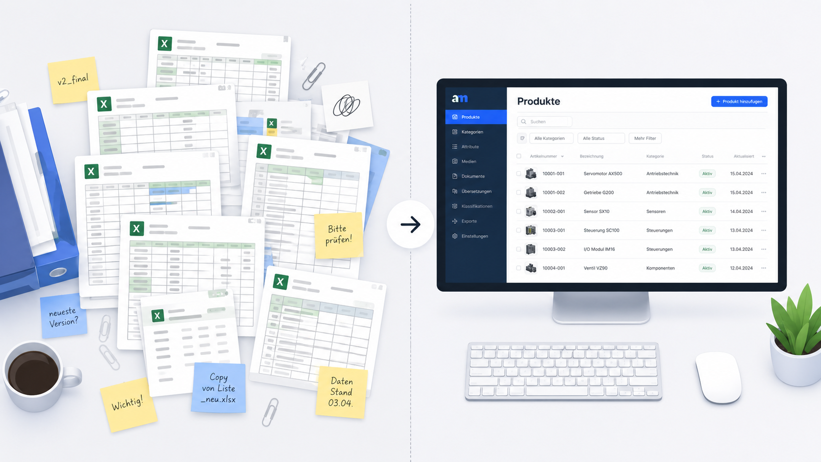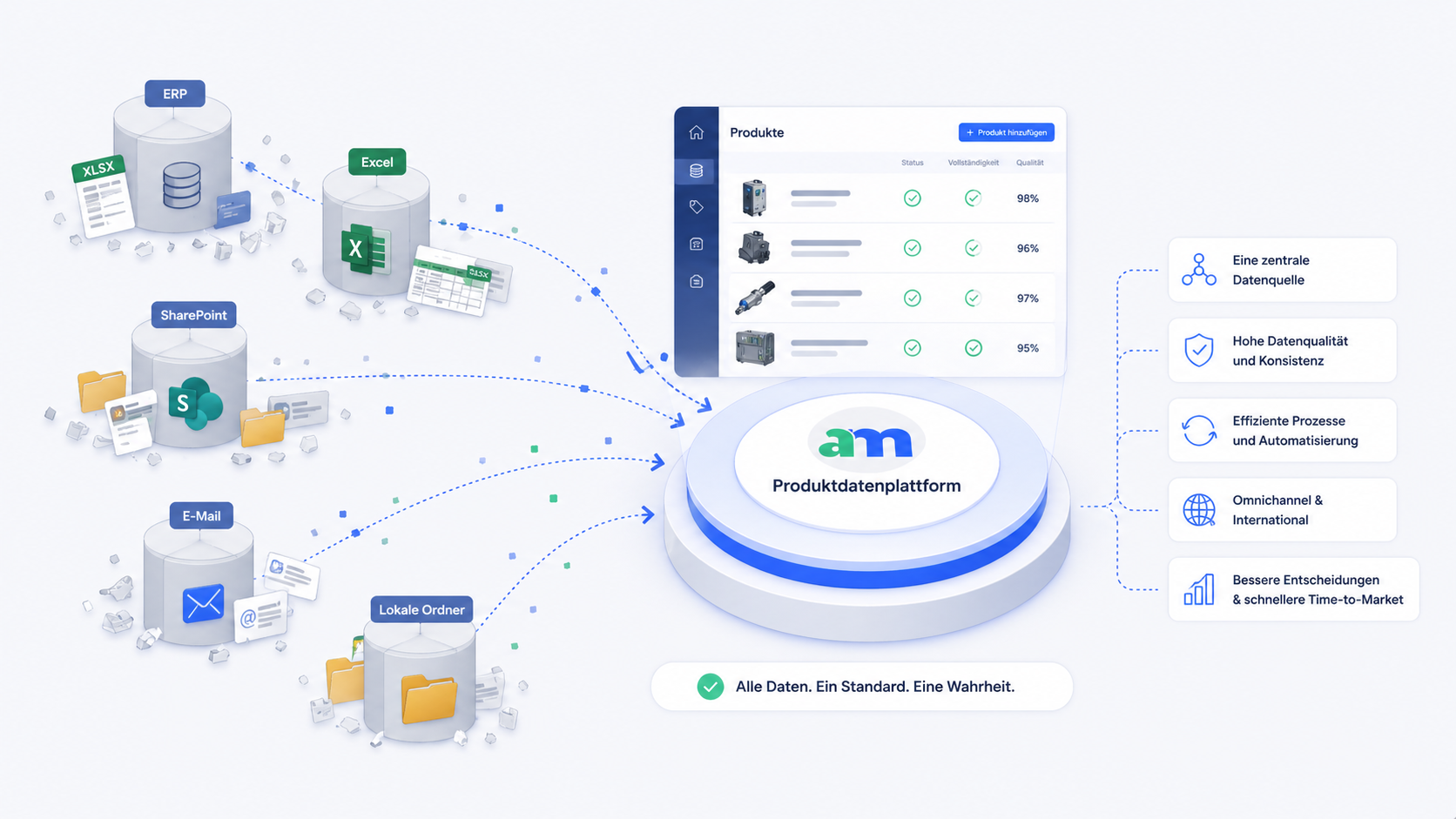 Ein mittelständischer Maschinenbauer mit 350 Mitarbeitern und 2.500 SKUs (Maschinen, Komponenten, Ersatzteile) stand vor einem klassischen Problem: Produktdaten waren über sieben verschiedene Systeme und Formate verteilt – ERP, Excel-Listen, SharePoint, E-Mail-Anhänge, lokale Ordner.